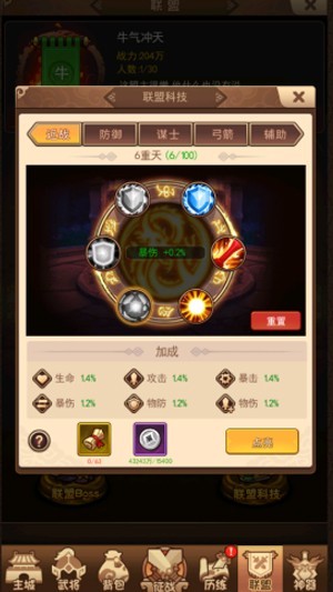 在这里联盟成员可以通过贡献值和银币点亮五个职业的属性。刚开始属性值很少,但是随着每天的奉献,点亮,游戏属性会逐渐增加,最高可以增幅20%。这些属性会附加到武将身上,帮助联盟成员闯关,竞技,打副本等等,相当于武将身上多带了一套装备。