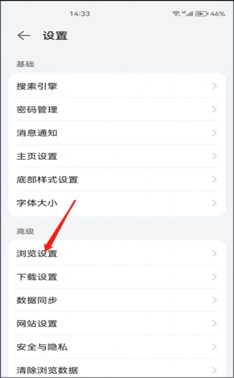2、在设置页面点击浏览设置;