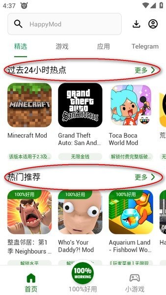 打开happymod后,首页就展示了“过去24小时热点”和“热门推荐”,可点击进入查看受欢迎的mod;