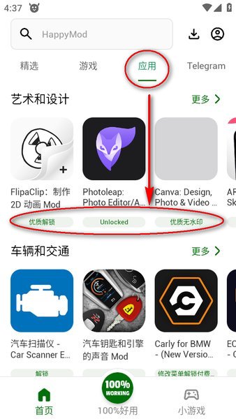 “应用”里面就是各种修改版的app,原版收费的应用程序,这里全部都是免费使用,解锁vip会员功能;