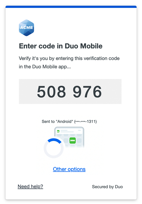 如果您的组织要求进行 Duo Push 验证,则当您选择使用 Duo Push 登录该应用时,Duo Universal Prompt 会在屏幕上显示一个六位数验证码。
