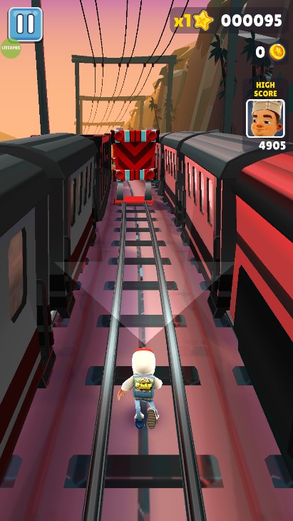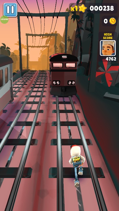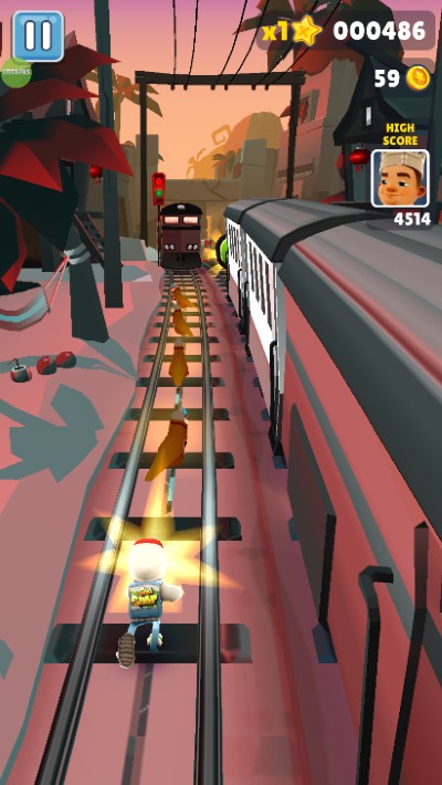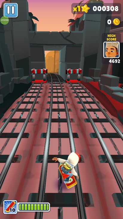 通过双击屏幕来启动滑板,滑板会持续一段时间。在没有滑板的情况下,角色撞到火车或者障碍等都会被抓住,导致游戏结束。但在有滑板的状态下,角色就有了一道保险,撞到火车等的时候,滑板会消失,游戏可以继续进行。