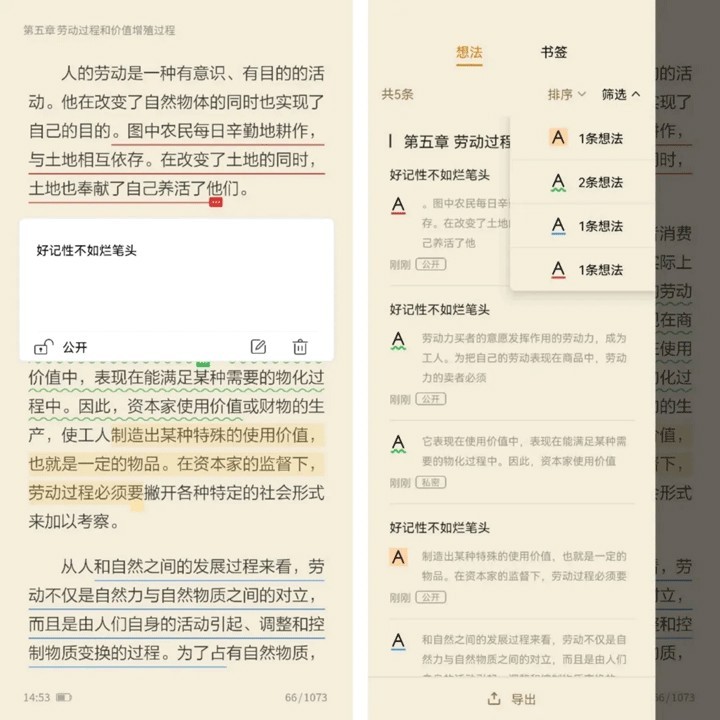支持荧光笔阴影线、波浪线、直线等多种形式标注重点,写想法做笔记。查看笔记时也支持分类查看重点、难点,还支持笔记导出到邮箱或印象笔记,更方便归纳整理笔记。