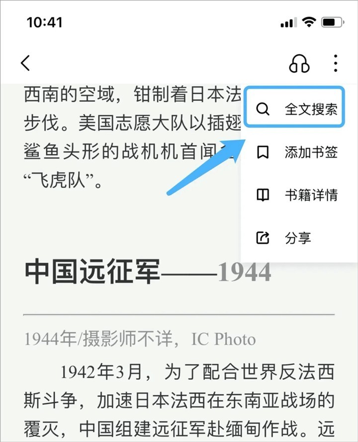 轻点屏幕唤出菜单后,右上角点击【全文搜索】 -输入关键词