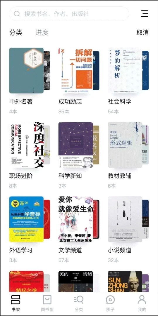 点击“筛选”,书架的书籍可按书籍分类、阅读进度进行分类管理,或者直接拖动书籍封面图创建文件夹,阅读计划更加一目了然。