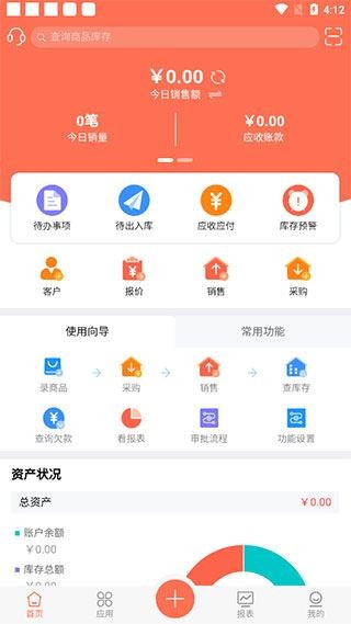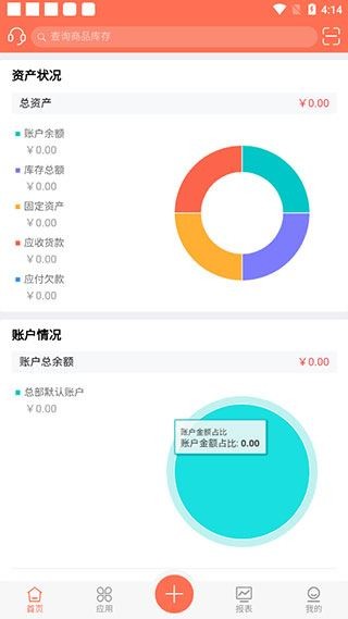 1、下载进入智能云ERP,在首页中,可以查看每日的销量和销售额情况,还可以查询商品库存;