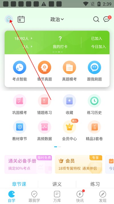1、进入首页后,点击当前科目旁的对号