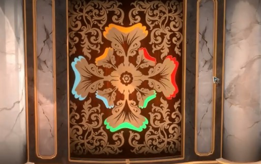 3、将镜头切换至面具背后区域,点击中央装置,旋转转盘,让两侧板块滑入中央卡位。