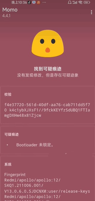 4、然后启动momo环境检测软件后提示环境有问题,检测出面具的隐藏root模块