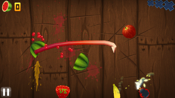 Zen:图标为苹果的Zen模式中,没有炸弹,只会不断出现水果,时间为1分半。在这一分半内谁因连击而切出的分数越高,谁就是胜利者。游戏不会因水果的掉落而失败。