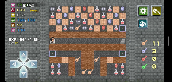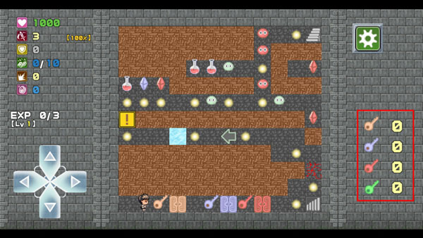 该游戏是以爬塔的方式进行的,期间在魔塔中的每一层都有不同的道具、钥匙、以及怪物的把守,玩家需开动脑筋思考,如何运用巧妙的策略来以最小的血量获取最大的输出,其中钥匙是打开不同门的独有道具: 黄钥匙可以打开黄色的门; 蓝钥匙可以打开蓝色的门; 红钥匙可以打开红色的门;