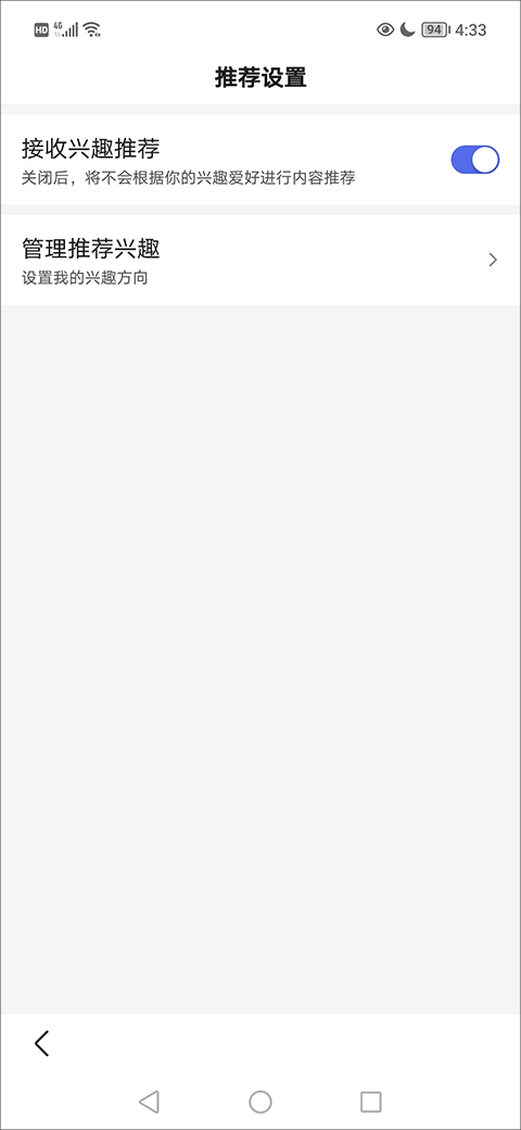 5、这里是推荐设置界面,这里可以对兴趣推荐、管理兴趣进行操作;