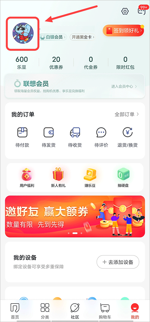 1、首先打开联想智选app,在我的界面点击“头像”进到我的信息界面。