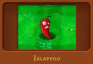 火爆辣椒在种植后可以即刻攻击一整列的敌人,给它们90豌豆伤害,灰烬效果。同时清除雪橇车僵尸留下的冰道,可以抵消僵王博士留下的冰球。名字源自于墨西哥辣椒。