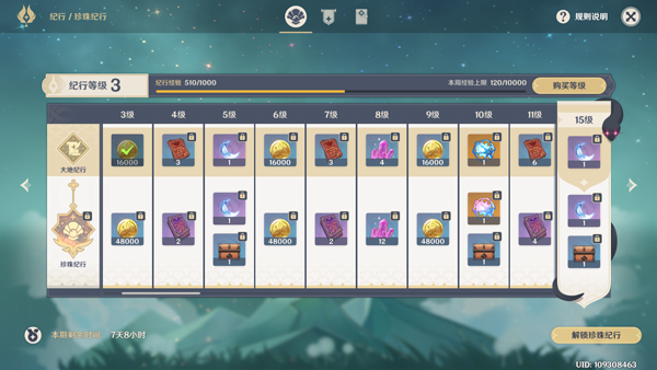 1、纪行:提升纪行等级,每提升10级可获取一个蓝球,即160原石。