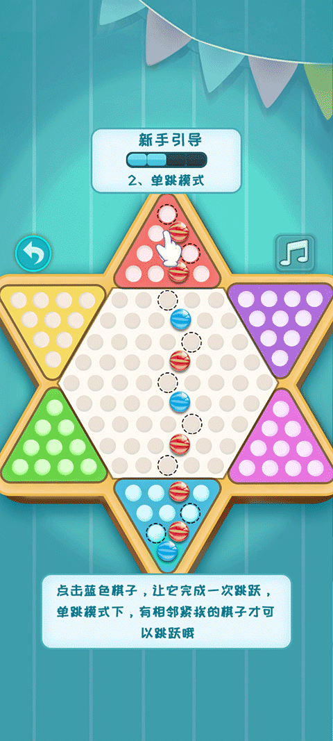 2、点击蓝色棋子,让它完成一次跳跃,单跳模式下,有相邻紧挨的棋子才可以跳跃哦!