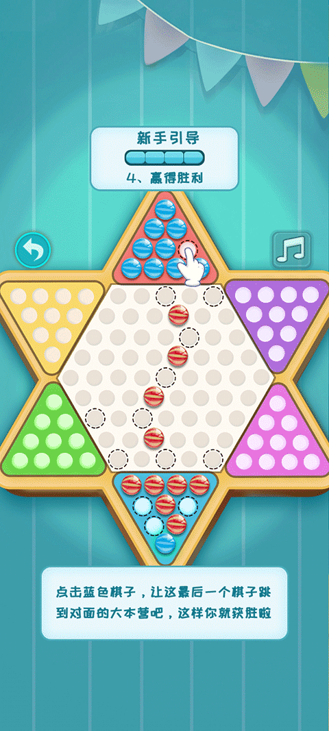 4、点击蓝色棋子,让这最后一个棋子跳到对面的大本营吧,这样你就获胜啦!