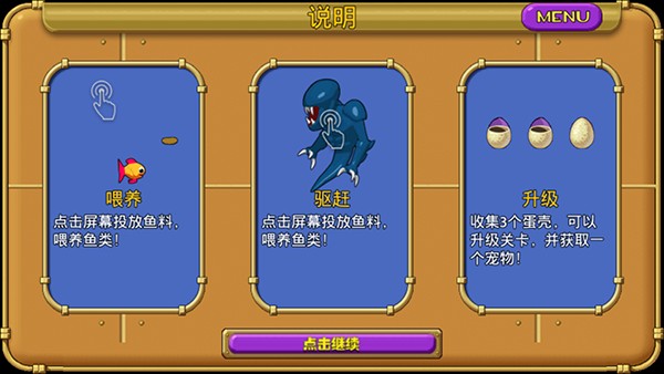 1、比如以冒险模式为例,游戏说明点击屏幕投放鱼料喂鱼,驱赶怪物,收集三个蛋壳可以获取一个宠物和升级关卡;