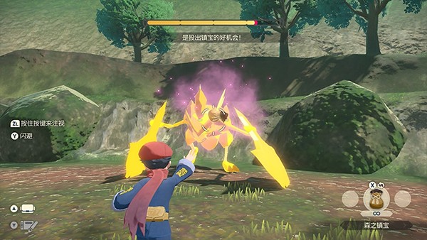 要将“镇宝”命中狂暴大闹的“王”和“女王”并非容易。它们会不断对主人公放出强力的攻击,因此看透招式的种类和时机,在闪避的同时寻找机会这点很重要。一旦发现了它们露出一瞬的破绽,就立马投出“镇宝”吧。用投出精灵球的要领来好好瞄准它们,会比较容易命中。
