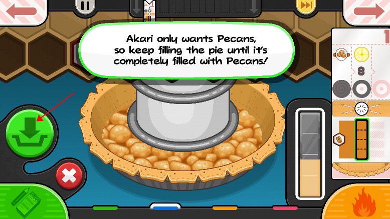 7、左右拖动上方的格子可以选择水果,将需要的水果对准木盆中间。