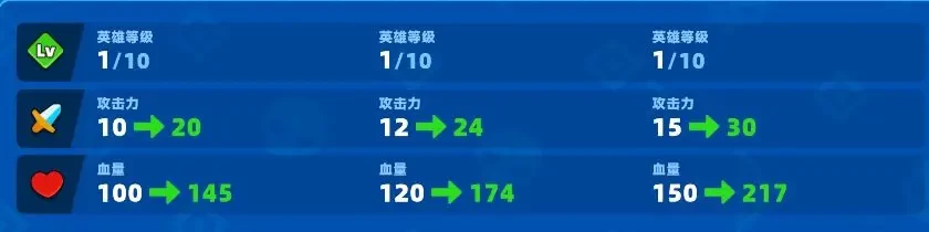 英雄品质分紫色、橙色和红色,品质差异首先体现在等级属性,以下分别是紫色、橙色和红色品质英雄每提升1级的属性成长: