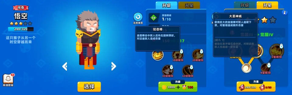 等级技能可以被动增强角色能力,降低局内组合难度;而觉醒技能则拥有改变场上局势、一键清屏的能力。以下以悟空和毒药师为例: