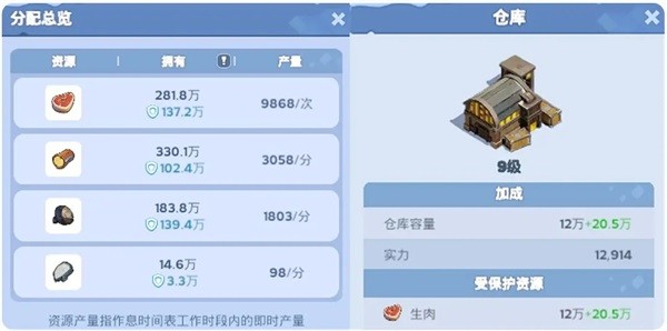 以生肉为例,根据以上两张截图,可被掠夺的生肉为:281.8万 - 137.2万 - (12万 + 20.5万) = 112.1万