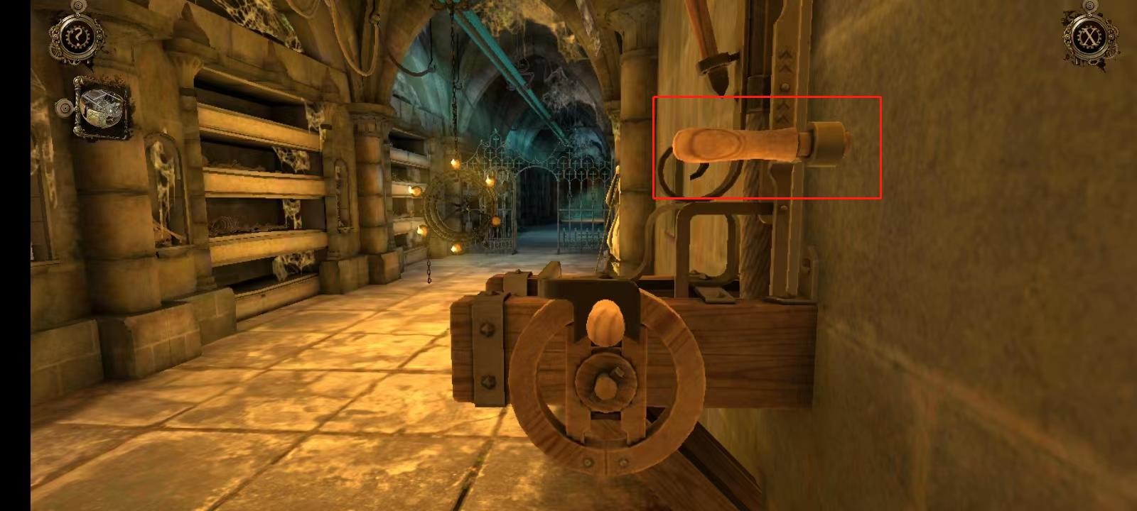 14、向右摇动机关上的摇柄直到机关卡死,机关卡死后会出现把手,向上拖动它,再重复一次;