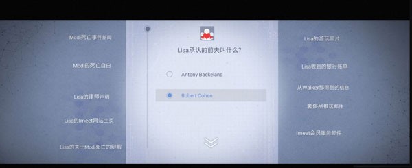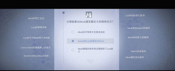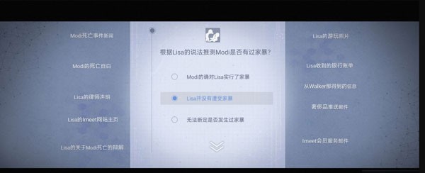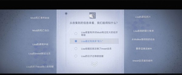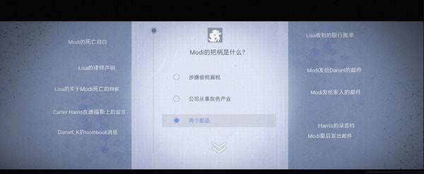 18. 收集完之后点右上角推理,第二个推理【Lisa骚扰Modi】—【两个都是】—【面临破产】。