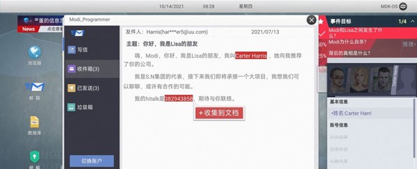 15.登录邮箱后在第三个邮件收集【Carter Harris】 、【Hitalk:382943858】。