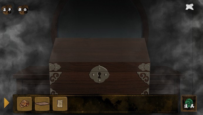 点击书桌中间抽屉上的密码锁,根据锁面上的图案提示,结合使用镂空木片后的书上的线索,输入密码“明岁失丧”。