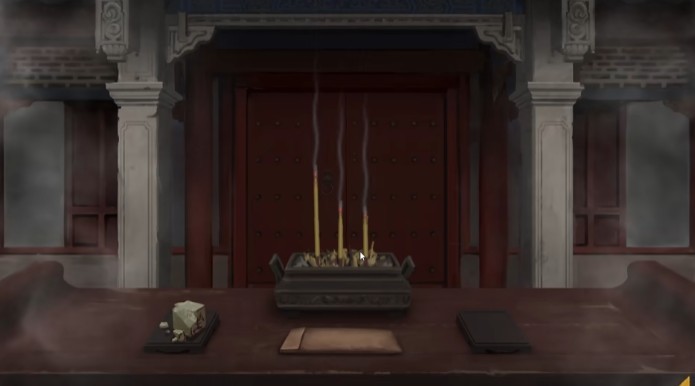 把【四根香】插入香炉中,用【点燃的烛台】点燃。