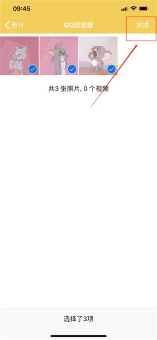 4、进入手机相册界面,将需要打包的照片全部选中,点击“完成”,如下图所示。