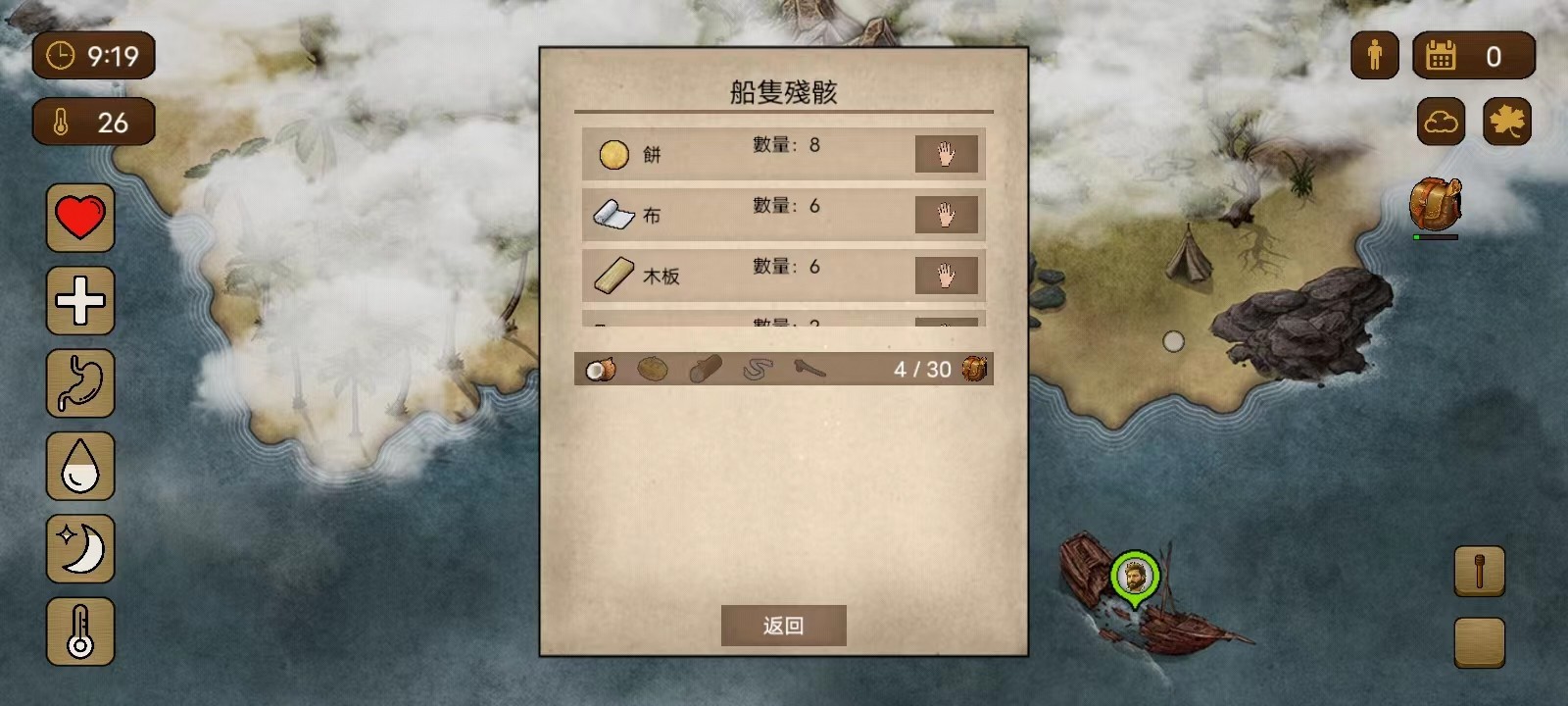 6、点击右下角的向右图标可以进入大地图,然后玩家可以点击船只残骸就可以进行探索,并拾取残骸上的物品;