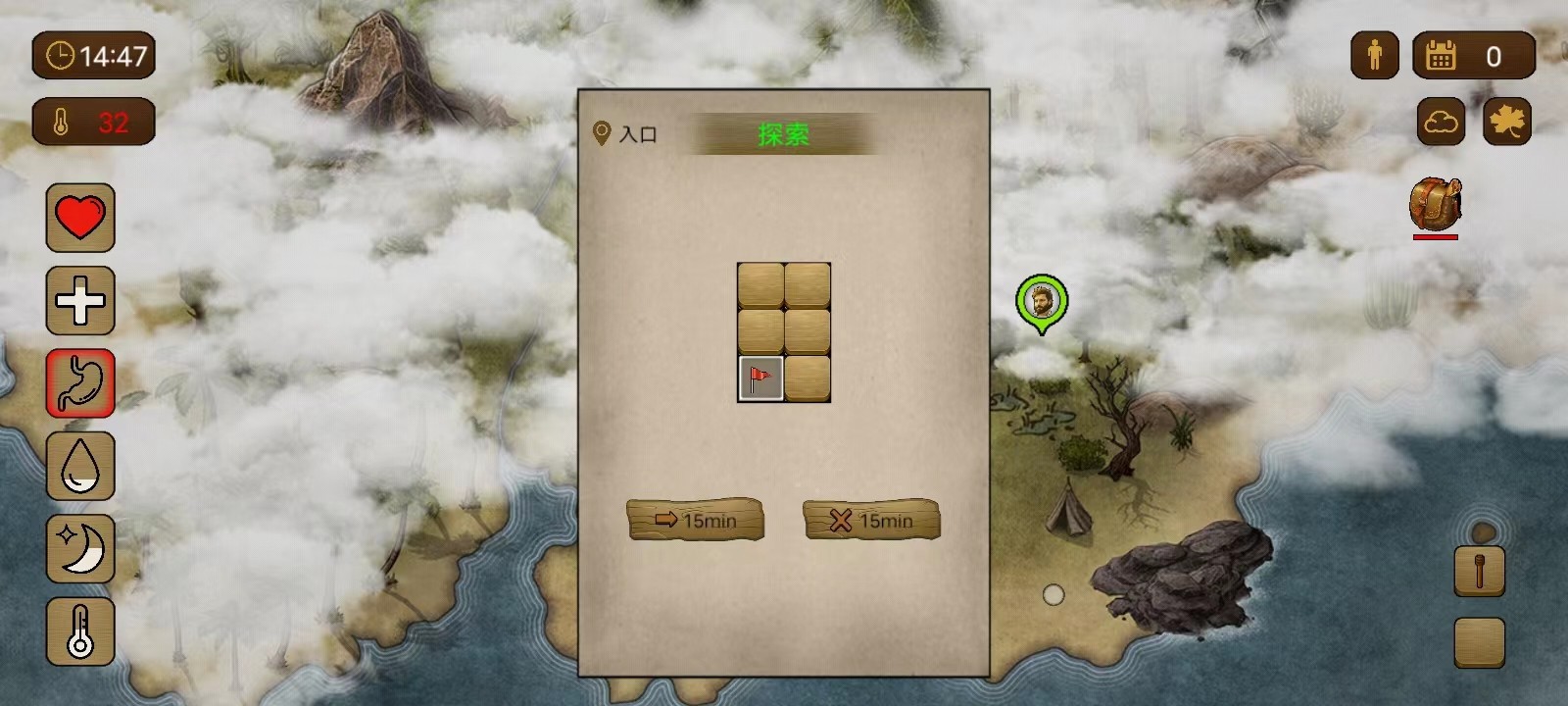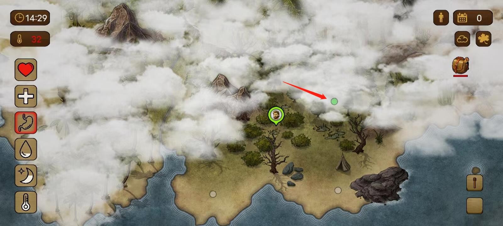 7、当左边第三个图标出现红色的时候,代表饿了,玩家可以打开背包,先吃点东西;玩家还可以点击图片上的绿点进行探索;
