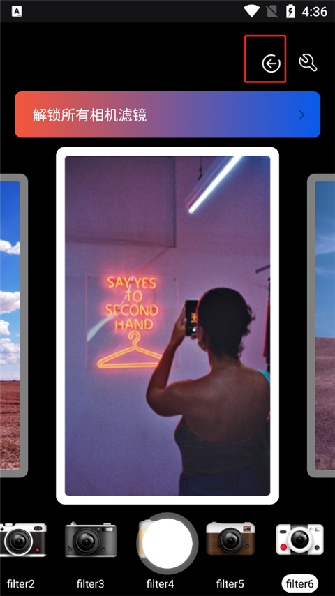 1、进入软件,它为用户提供了海量的胶卷滤镜,你只需选择自己喜欢的滤镜,点击中间的拍照键即可;