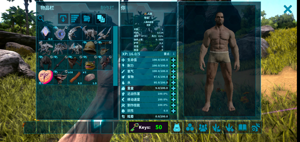 6、完成后,点击左上角背包可查看角色各项属性,现在开始你的生存冒险吧。