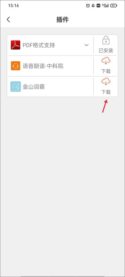 3、这里显示了三个插件:PDF格式支持、语音朗读。中科院、金山词霸,点击右边的“下载”。