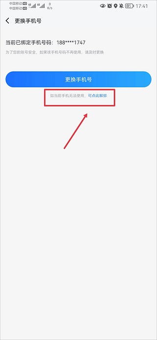 3、然后在更换手机号下方,点击若当前手机无法使用,可点此解绑