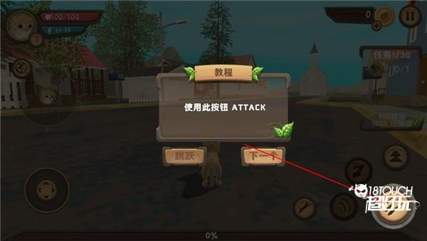 5、这是游戏开始的界面,左侧下面的方向键可以控制猫咪的走动,右侧五个按钮作用各不相同,最大的按钮可以攻击杀死老鼠的,围着的三个按钮是技能,大家可以自己摸索,还有一个“猫咪向前跳跃”的按钮,可以使猫咪向前跳跃。