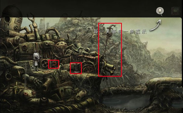 1、打开机械迷城手机版游戏后,可以看到一些介绍,点击图中标红的位置,上面那个盒子下面会出现机器人的身子,左下角是机器人的头,他们会组合成一个机器人;