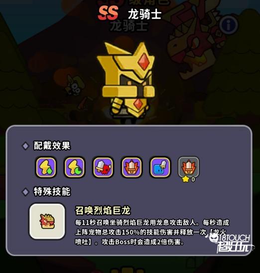 技能: 每11秒召唤烈焰巨龙,喷吐龙息,每秒造成上阵宠物总攻击150% 的巨额范围伤害,对Boss造成双倍伤害。