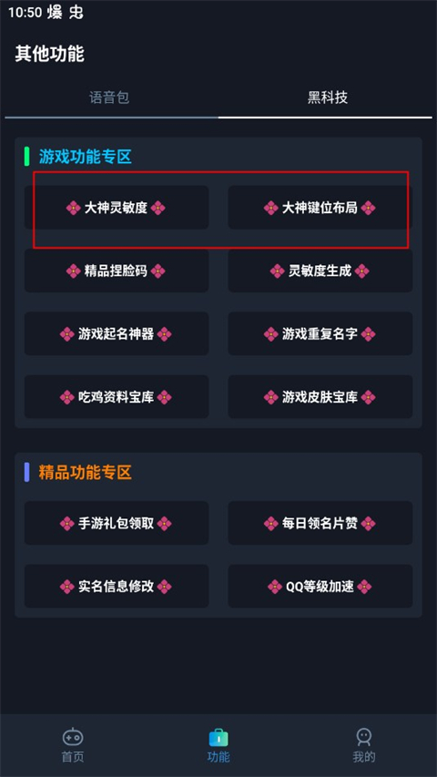 2、可以在功能栏当中找到黑科技选项,在这里面有着各种大神的参数设定,可以自由选择使用。