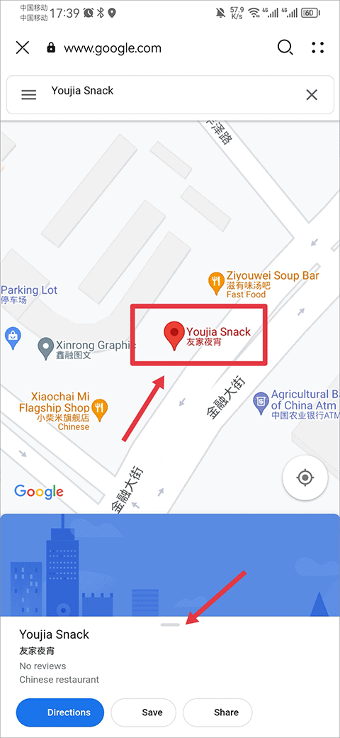 4、点击后会将页面上拉后即可查看店铺的详细位置、邮编、电话等信息
