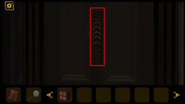 6、利用门上的花纹打开关着的房门,分别是右一、左二、右二,进门后查看小桌子上的书籍,看到墙上的钟表黄色指针指向lX