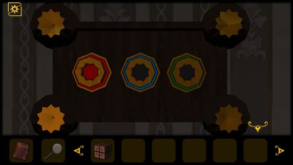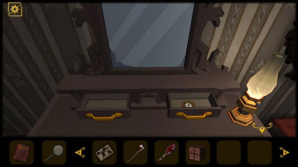 9、从镜子下面的抽屉中获得手表,点击之前获得的魔方道具,,点击搜索按钮将墙上的小魔方拼成获得的魔方一样的图形即可解谜拿到宝石道具