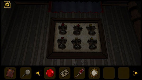 11、回到带血的房间,将摆件放到沙发旁边的桌子上,得到面具谜题的解谜图像,回到面具处调整面具的位置,位置分别是上:红色六边形、红色四边形、黄色三角形,下:红色三角形、黄色三角形、黄色四边形,得到一张唱片