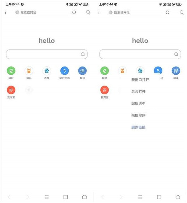 安装好后「米侠浏览器」的默认启动页很清爽干净,不像某些浏览器会推送一些新闻等乱七八糟的功能,如果你对自带的网址不喜欢,可以长按来删除、编辑、或者自己添加一些常访问的网址。