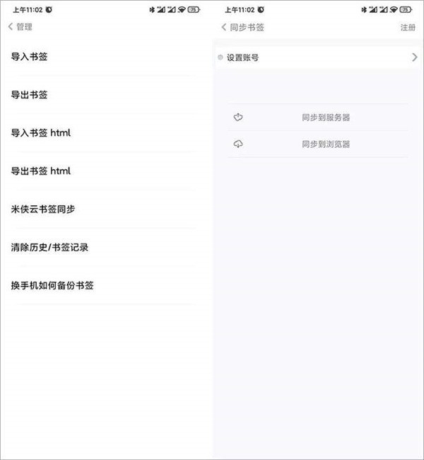 最后说下书签功能吧,支持导入你之前浏览器的书签,支持 html 的格式书签文件。如果你需要书签同步功能,可以通过注册米侠同步账号。