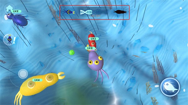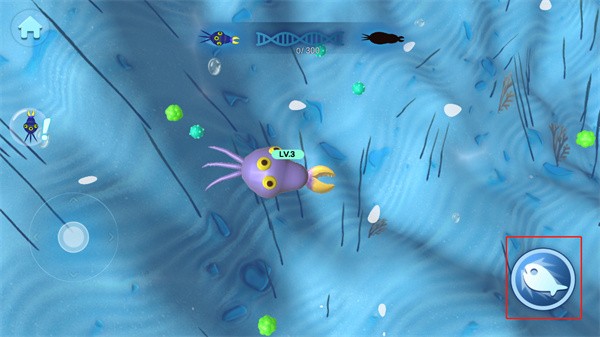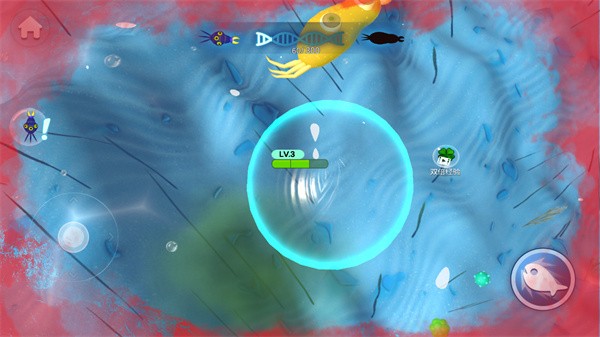 3、游戏中右下角的按键可以帮助细胞快速移动,帮助细胞来捕捉比自己等级低的细胞,还可以通过按键来逃离比自己等级高的细胞;